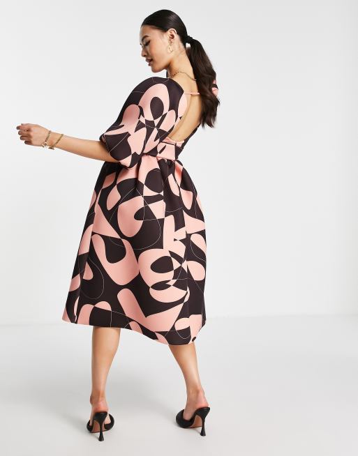 Asos Design Puff Sleeve Skater Dress With Belt In Abstract Print Asos